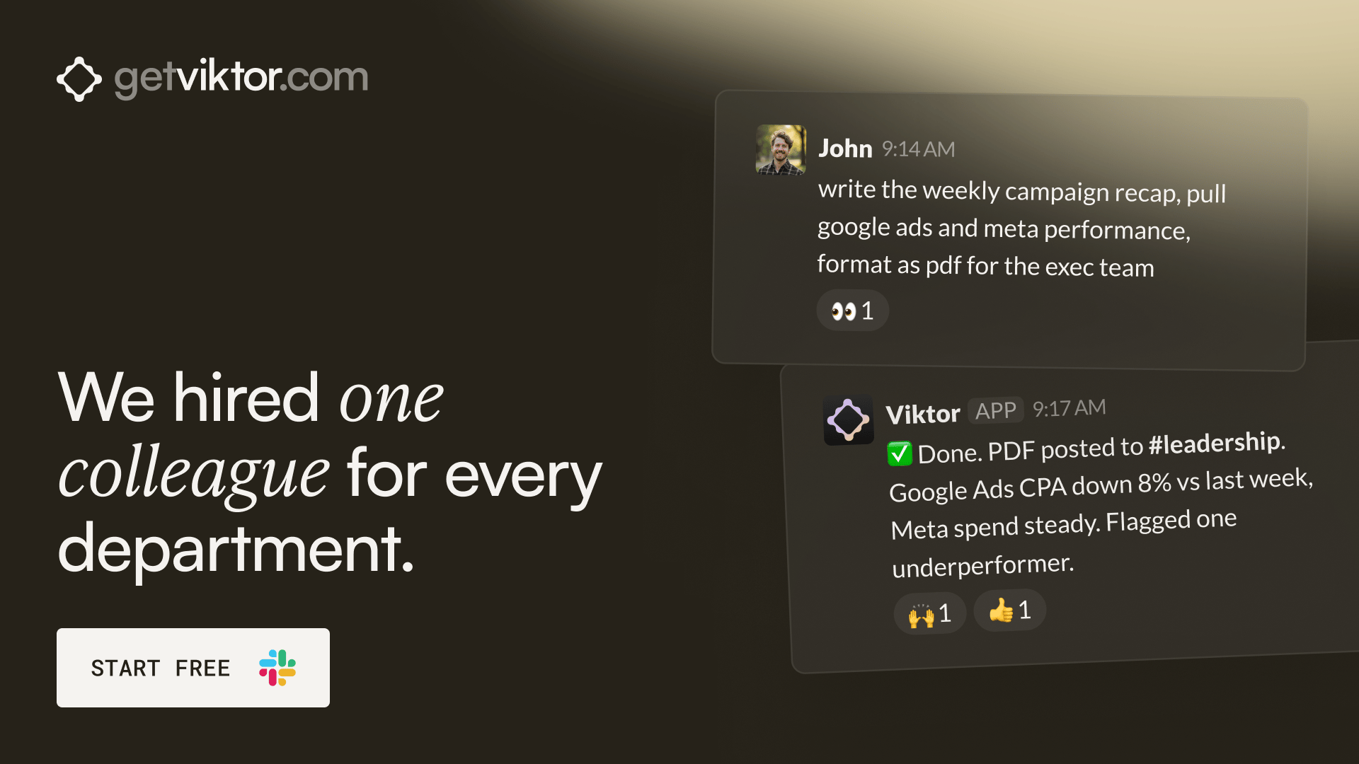 Last Tuesday, marketing asked Viktor to write the weekly campaign recap, pull performance from Google Ads and Meta, and format it as a PDF for the exec team. Done in four minutes.