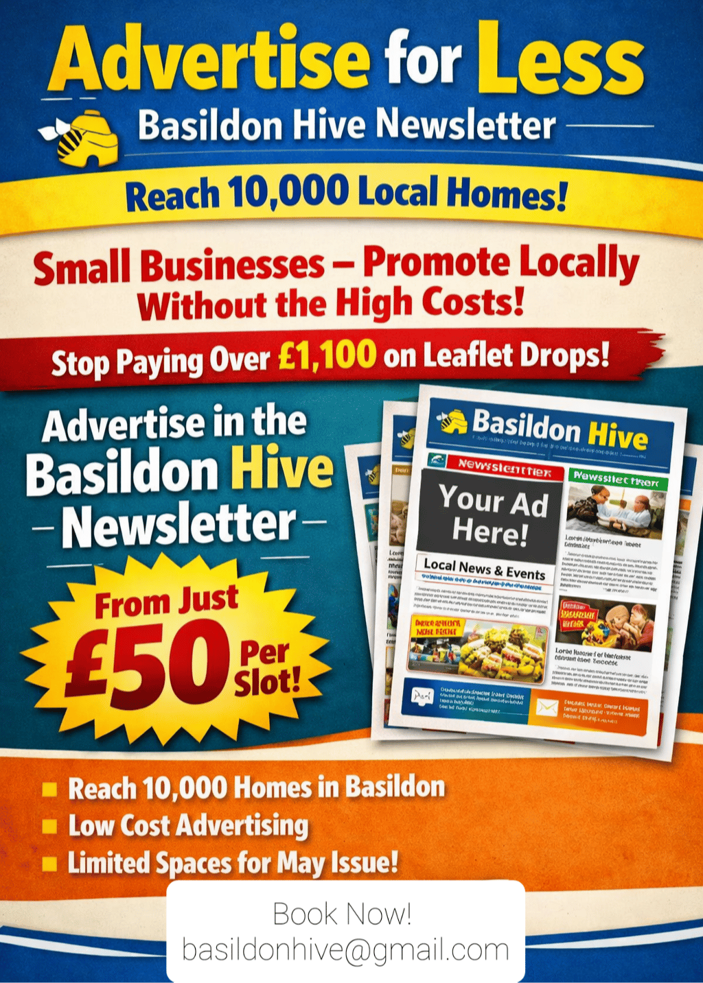 Small businesses can now reach 10,000 homes without the high cost of leaflet drops. Instead of paying over £1,100, you can advertise in the Basildon Hive printed newsletter from just £50 per slot. Limited spaces available for the May issue. Click here to register your interest when slots open.